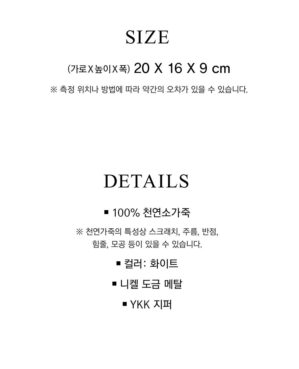 - 천연 가죽 특성상 스크래치, 주름, 반점, 힘줄, 모공 등이 있을 수 있으며 이는 가죽 고유의 특성에 해당하는 부분이므로 불량 사유에 해당하지 않습니다.